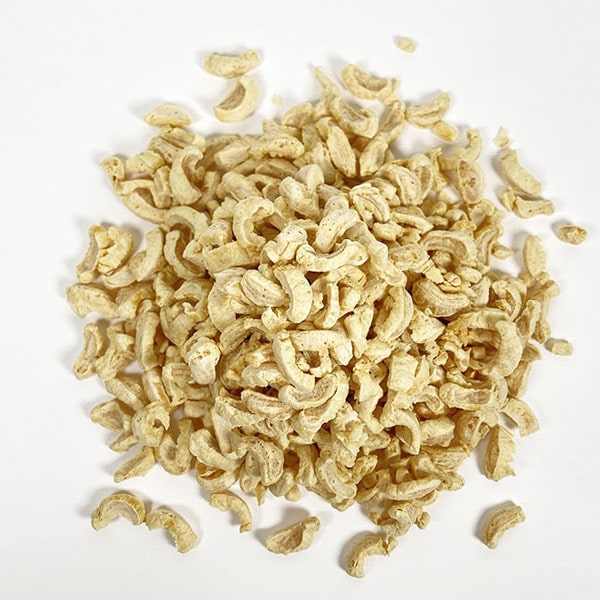 大豆を使用していない植物性ミートです。水やお湯に浸し柔らかく戻すか、少量の水分や調理料を加えて優しく揉み込むだけでも調理が出来ます。メニューによっては水戻しせずそのままご使用頂けます。本商品は加熱調理せず食べる事もできますので、そのままスープ、サラダのトッピングやスナックとしても召し上がれます。
