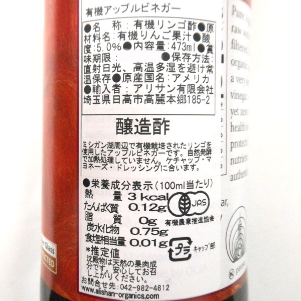 【関連ワード】瓶,ビン,びん,調味料[お酢]おす,純酢[果実酢]かじつす,かじつ酢,くだもののす,くだものす,果物酢,しーるどびねがー,フルーツビネガー,フルーツ,シードル[りんご酢]林檎酢,リンゴ酢,ビネガー,vinegar,リンゴビネガー,アップルビネガー,食酢,林檎酸,りんご酸[有機]有機JAS認定,オーガニック,JAS認定,オーガニック栽培,有機栽培[販売]Eden Foods,エデンフーズ,アリサン有限会社