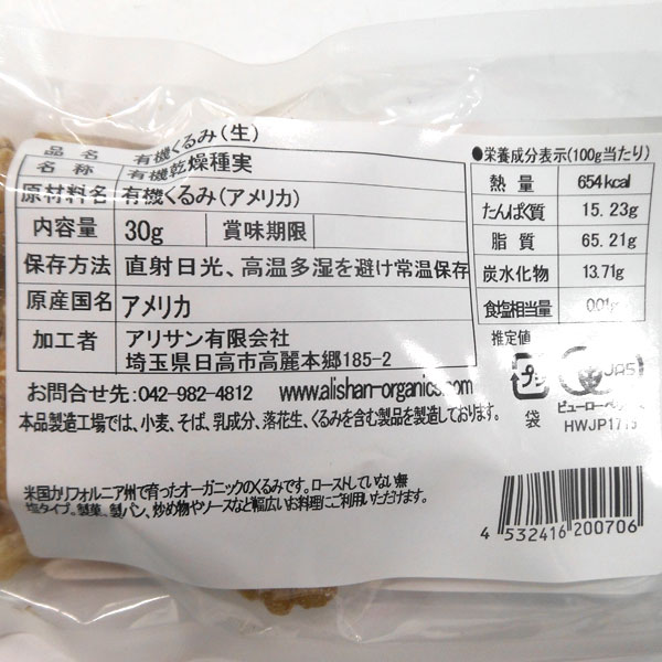 【在庫限り】有機くるみ(生) ジッパー付き袋(30g)【アリサン】