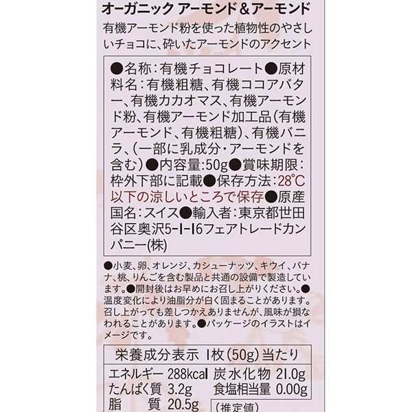 【原材料】有機粗糖、有機ココアバター、有機カカオマス、有機アーモンド粉、有機アーモンド加工品(有機アーモンド、有機粗糖)、有機バニラ、(一部に乳成分を含む)