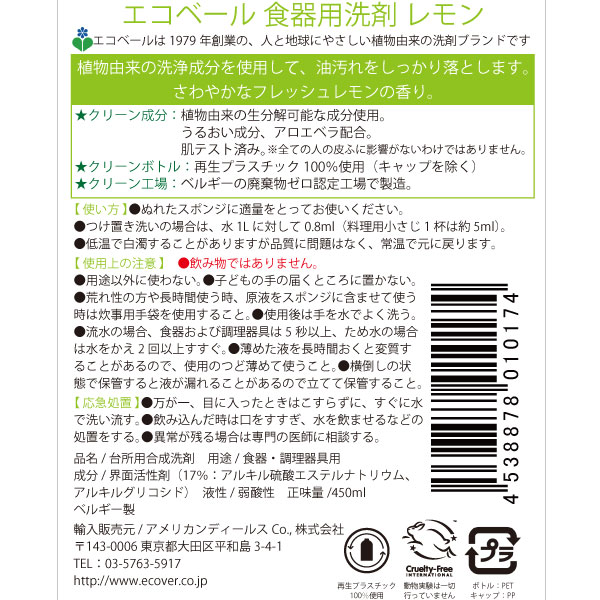 エコベール 食器用洗剤 レモン(450ml)【アメリカンディールスコーポレーション】