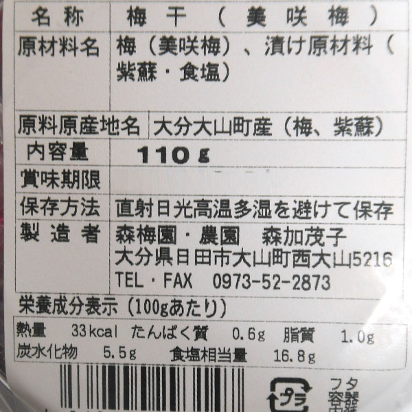 【原材料】梅(大分県大山町産)、漬け原材料[紫蘇(大分県大山町産)、食塩]