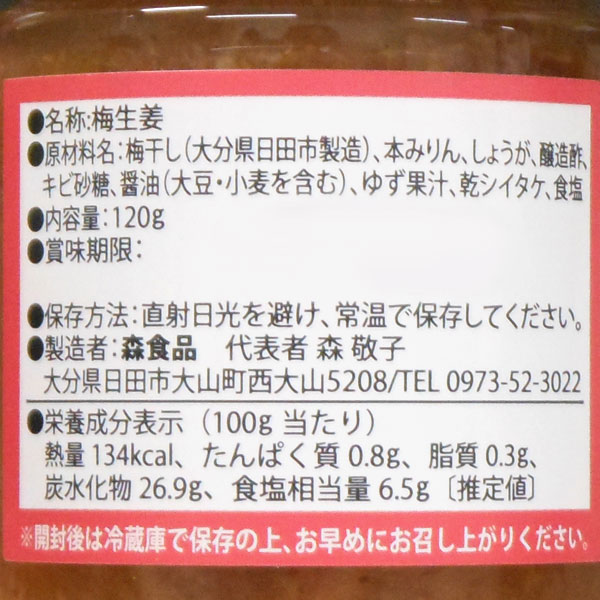 【原材料】梅干し(大分県日田市製造)、本みりん、しょうが、醸造酢、キビ砂糖、醤油(大豆・小麦を含む)、ゆず果汁、乾シイタケ、食塩