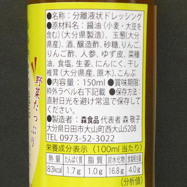 【原材料】醤油(小麦・大豆を含む)(大分県製造)、玉葱(大分県産)、酒、醸造酢、砂糖、りんご、りんご酢、人参、ゆず皮、菜種油、食塩、生姜、にんにく、干し椎茸(大分県産、原木)、こんぶ