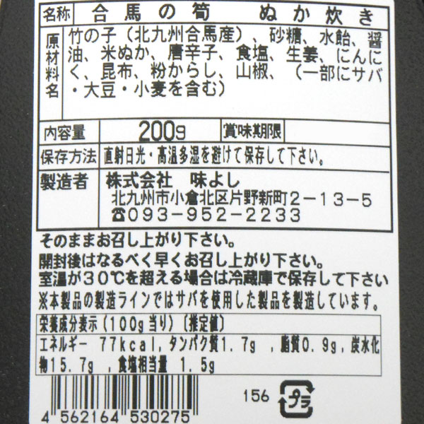 【原材料】竹の子(北九州合馬産)、砂糖、水飴、醤油、米ぬか、唐辛子、食塩、生姜、にんにく、昆布、粉からし、山椒、(一部にサバ・大豆・小麦を含む)
