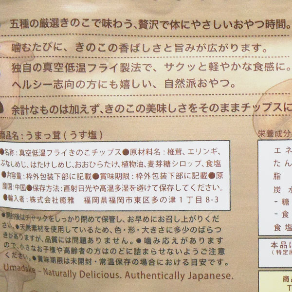 【関連ワード】真空低温フライきのこチップス,うまっ茸,きのこチップス,真空低温フライ,しいたけチップス,エリンギチップス,おおひらたけ,しろぶなしめじ,はたけしめじ,原木栽培,5種のきのこ,乾燥きのこ,きのこスナック,サクサクきのこ,ヘルシーおやつ,旨み凝縮[おかし]お菓子,おやつ[販売]ゆが,ゆうが,癒雅膳食,株式会社癒雅