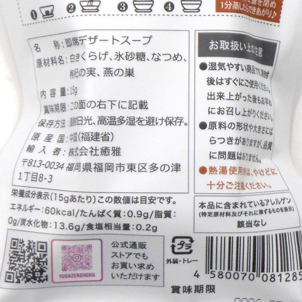 【関連ワード】デザートスープ(燕の巣白木耳棗羹),燕の巣白木耳棗羹,デザートスープ,中華スイーツ,薬膳デザート,燕の巣,ツバメの巣,つばめの巣,白木耳,しろきくらげ,シロキクラゲ,銀耳,ナツメ,なつめ,棗,乾燥ナツメ,中華スープ,中華デザート,ヘルシーデザート,カップデザート[おかし]お菓子,おやつ[販売]ゆが,ゆうが,癒雅膳食,株式会社癒雅