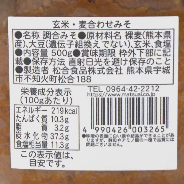 【原材料】裸麦(熊本県産)、大豆(遺伝子組み換えでない)、玄米、食塩