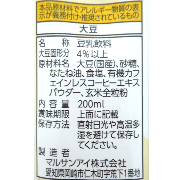【商品説明】国産大豆の豆乳に有機カフェインレスコーヒエキスパウダーと国産玄米全粒粉を加えた豆乳飲料