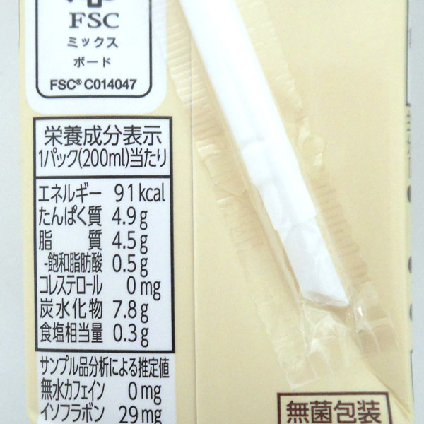 【栄養成分表示】(200mlあたり)エネルギー:91kcal、たんぱく質:4.9g、脂質:4.5g、炭水化物:7.8g、食塩相当量:0.3g、無水カフェイン:0mg、イソフラボン:29mg