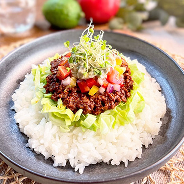 【タコライス】ご飯の上に本品を乗せ、レタス、トマト、チーズなどをトッピング。サルサソースをかければ、カフェ風タコライスの出来上がりです。