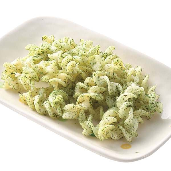 【商品説明】国産うるち米の粉末をくるくるした形状にしてフライし、カリポリ食感に仕上げました。青のり風味のスナックです。