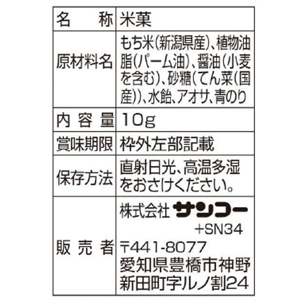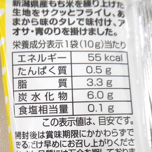 【原材料】もち米(新潟県産)、植物油脂(パーム油)、醤油(小麦を含む)、砂糖(てん菜(国産))、水飴、アオサ、青のり