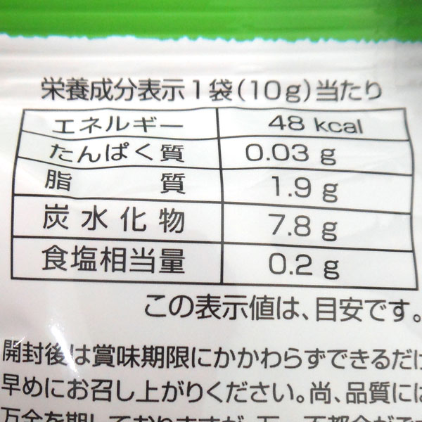 【栄養成分表示】(10gあたり)熱量:48kcal、たんぱく質:0.03g、脂質:1.9g、炭水化物:7.8g、食塩相当量:0.2g