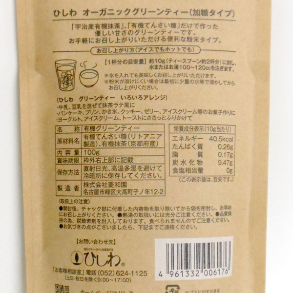 【商品説明】ひしわ「オーガニックグリーンティー」は、原料にこだわり、原材料は有機栽培で大切に育てられた宇治産「有機抹茶」と「有機てんさい糖」のみ。