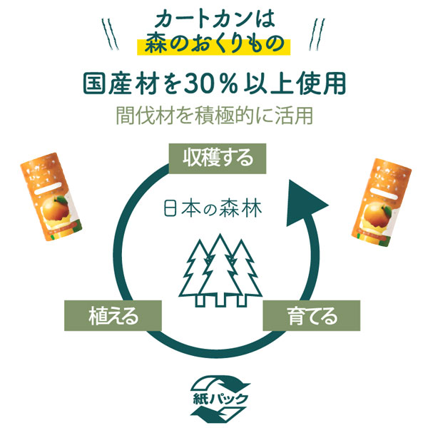 カートカンは間伐材を含む国産材を30%以上使用しています。間伐で発生した木材を用紙に有効利用しています。