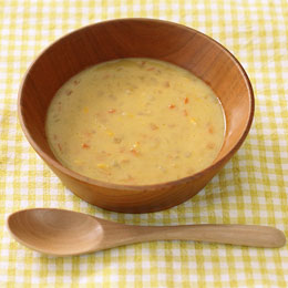 【原材料】野菜(とうもろこし、玉ねぎ、人参、じゃがいも)、豆乳、鶏がらスープ、コーンピューレ、植物油脂(菜種)、大麦ピューレ、粗糖、かぼちゃピューレ、でん粉、食塩、酵母エキス、(一部に大豆・鶏肉を含む)