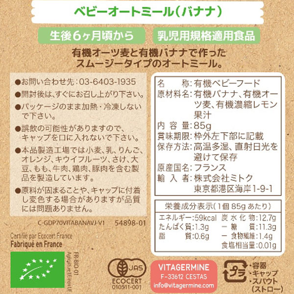 【関連ワード】ベビービオ ベビーオートミール バナナ ,babybio,べいびーびお,ベイビービオ,スムージー,オーガニック離乳食[ベビーフード]離乳食,離乳食,ベイビィー,ベイベー,赤ちゃん用,離乳食用,軽食[介護食]流動食,介護食用,やわらか食[非常食]防災食品,保存食品,非常食品,災害食品,食料備蓄品,備蓄食料品,防災備蓄食品[販売]オーサワジャパン株式会社[有機]有機JAS認定,オーガニック,JAS認定,オーガニック栽培,有機栽培[販売]Vitagermine(ヴィタジェルミン)(フランス),株式会社ミトク