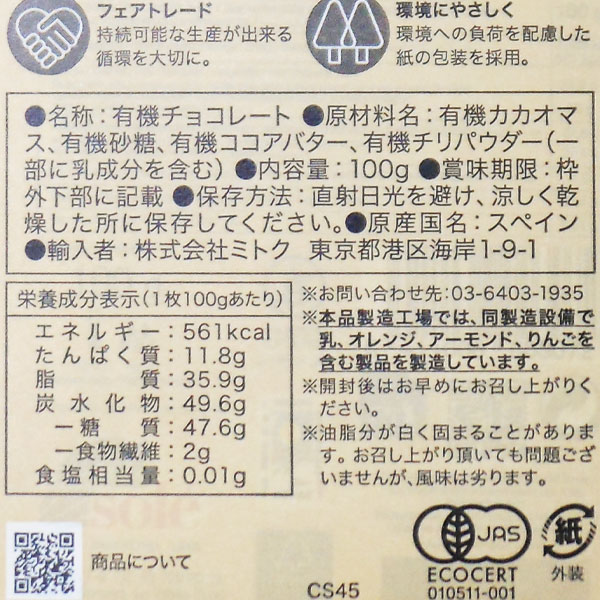 【原材料】有機カカオマス、有機砂糖、有機ココアバター、有機チリパウダー(一部に乳成分を含む)