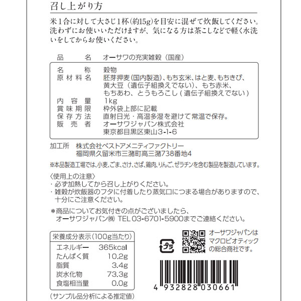 【原材料】胚芽押麦、もち玄米、はと麦、もちきび、黄大豆、もち赤米、もちあわ、とうもろこし(国産)