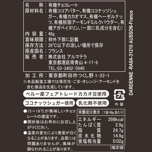 【原材料】有機ココアバター、有機ココナッツシュガー、有機カカオマス[有機カカオ豆(ペルー)]、有機ヘーゼルナッツ(イタリア、トルコ)、有機脱脂アーモンドミルクパウダー、有機アガベイヌリン