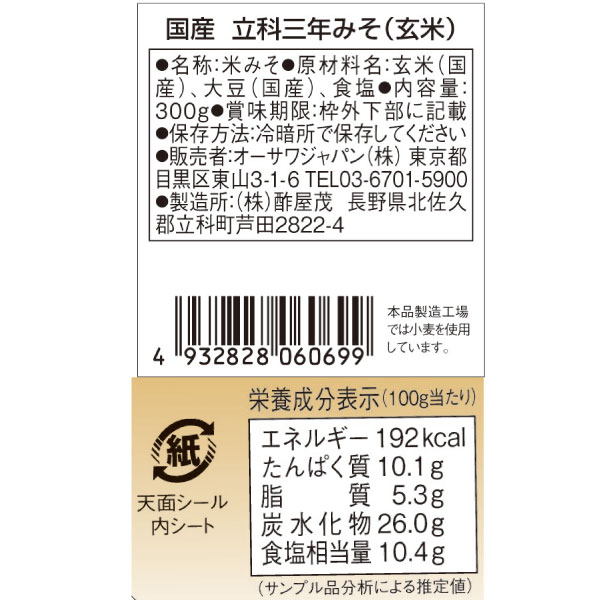 【数量限定】国産立科三年みそ(玄米)(300g)【オーサワジャパン】