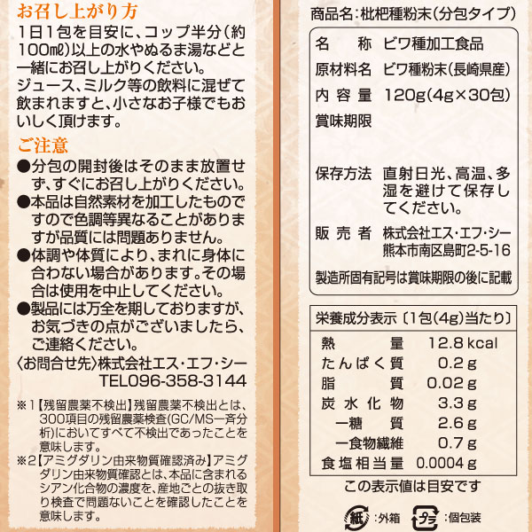 【入荷未定】【数量限定】枇杷種粉末(分包タイプ)(120g(4g×30包))【エス・エフ・シー】
