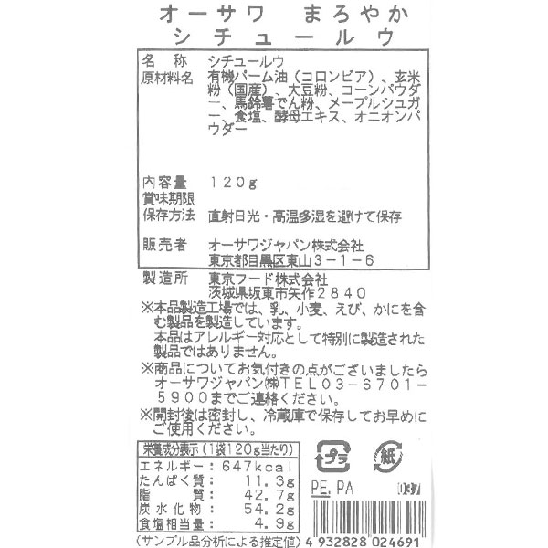 【原材料】有機パーム油(コロンビア)、玄米粉[米(山形・宮城・秋田県)]、大豆粉[大豆(国産)]、コーンパウダー[とうもろこし(国産)]、馬鈴薯でん粉[じゃがいも(北海道)]、メープルシュガー、食塩(天日塩)、酵母エキス、オニオンパウダー