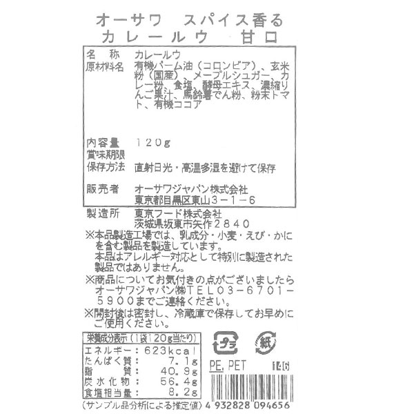 【原材料】有機パーム油(コロンビア)、玄米粉(山形・宮城・秋田県)、メープルシュガー、カレー粉、食塩(天日塩)、酵母エキス、濃縮りんご果汁、馬鈴薯でん粉[じゃがいも(北海道)]、粉末トマト、有機ココア