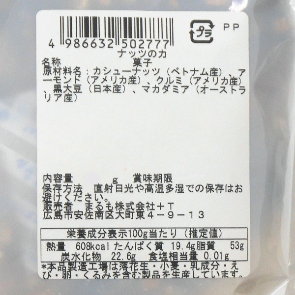 【原材料】カシューナッツ(ベトナム産)、アーモンド(アメリカ産)、クルミ(アメリカ産)、黒大豆(日本産)、マカダミア(オーストラリア産)