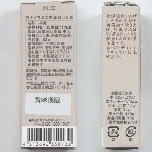 【商品説明】北海道産の白いんげん豆とてんさい糖の白あんに、京都府産有機ほうじ茶をたっぷり配合した、食べきりサイズのミニ羊羹です。ほうじ茶の香ばしい香りを引き出すため、深炒りのほうじ茶を使用しました。