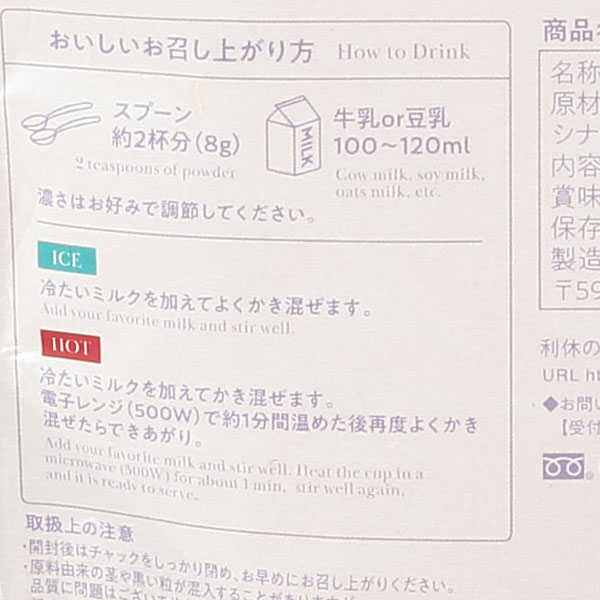 スプーン約2杯分(8g)に対し、牛乳or豆乳100~120ml。濃さはお好みで調節してください。