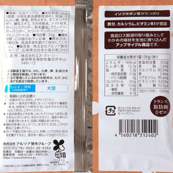 【関連ワード】国産大豆でつくった大豆チップスシリーズ,だいずチップス,スナック菓子,ノンフライ,大豆スナック,プロテインスナック,たんぱく質,タンパク質,プロテイン,イソフラボン,ダイエット,大豆ミートチップス,ソイチップス,野菜チップス,栄養補給,子供,補給[おかし]お菓子,おやつ[菜食主義]ベジタリアン,ヴィーガン,ビーガン,Vegan,ビーカン,ヴィーカン[販売]BIOKURA,ビオクラ,株式会社アルソア慧央グループ