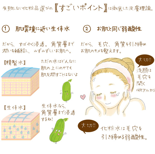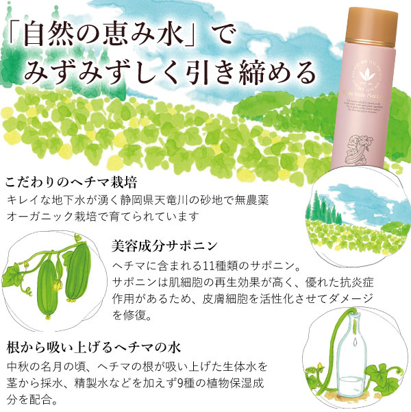 ヘチマの茎から採水するヘチマ水をベースに、9種の植物保湿成分を配合した弱酸性ローションです。肌なじみが良く肌を引き締めキメを整えます。