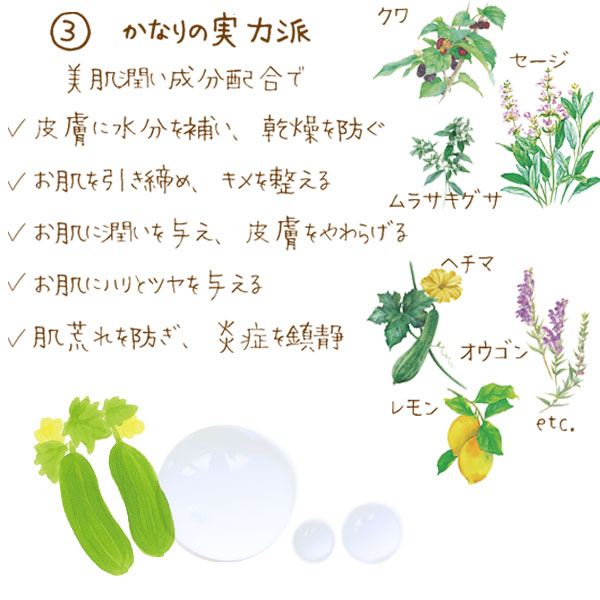 【原材料】ヘチマ水、BG、グリセリン、オウゴン根エキス、ムラサキ根エキス、マグワ根皮エキス、オランダガラシ葉/茎エキス、サボンソウ葉エキス、セイヨウキズタ葉/茎エキス、セージ葉エキス、レモン果実エキス、ゴボウ根エキス、ヒアルロン酸Na、PCA-Na、マルチトール、クエン酸、エタノール、水、メチルパラベン