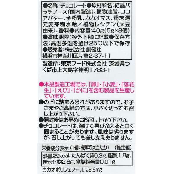 【栄養成分表示】(1個(標準5g)あたり)エネルギー:29kcal、たんぱく質:0.3g、脂質:1.8g、炭水化物:2.8g、食塩相当量:0.01g、カカオポリフェノール:28.5mg