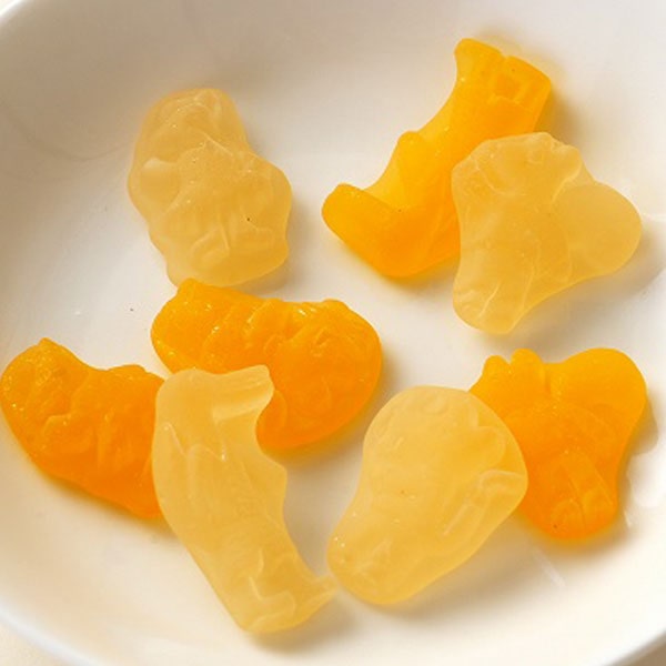 メイシーちゃんとお友達がかわいいグミになりました。うんしゅうみかん味ともも味の2つの味入り。国産果実の果汁使用・グミの色は果汁由来。北海道産てんさいの砂糖使用。