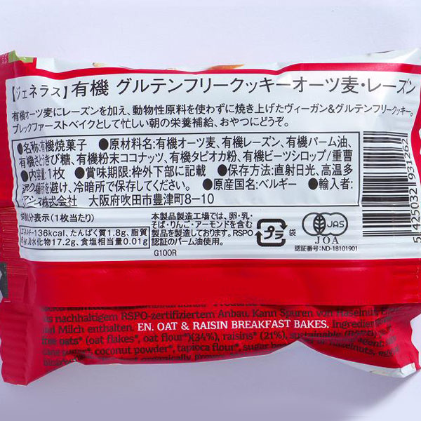 【原材料】有機オーツ麦、有機レーズン、有機パーム油、有機さとうきび糖、有機粉末ココナッツ、有機タピオカ粉、有機ビーツシロップ/重曹
