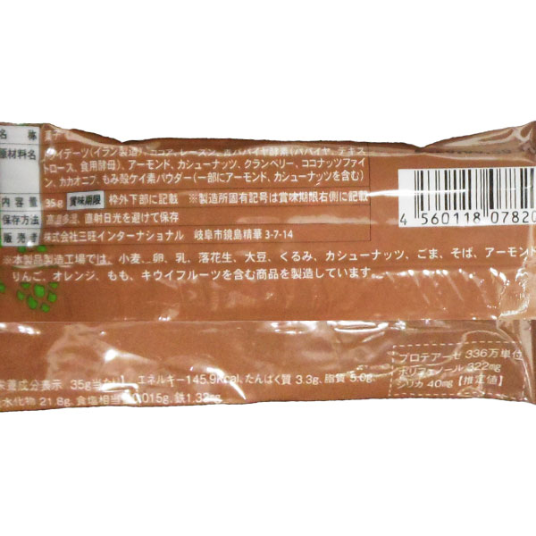 【原材料】ドライデーツ(イラン製造)、ココア、レーズン、青パパイヤ酵素(パパイヤ、デキストロース、食用酵母)、アーモンド、カシューナッツ、クランベリー、ココナッツファイン、カカオニブ、もみ殻ケイ素パウダー(一部にアーモンド、カシューナッツを含む)